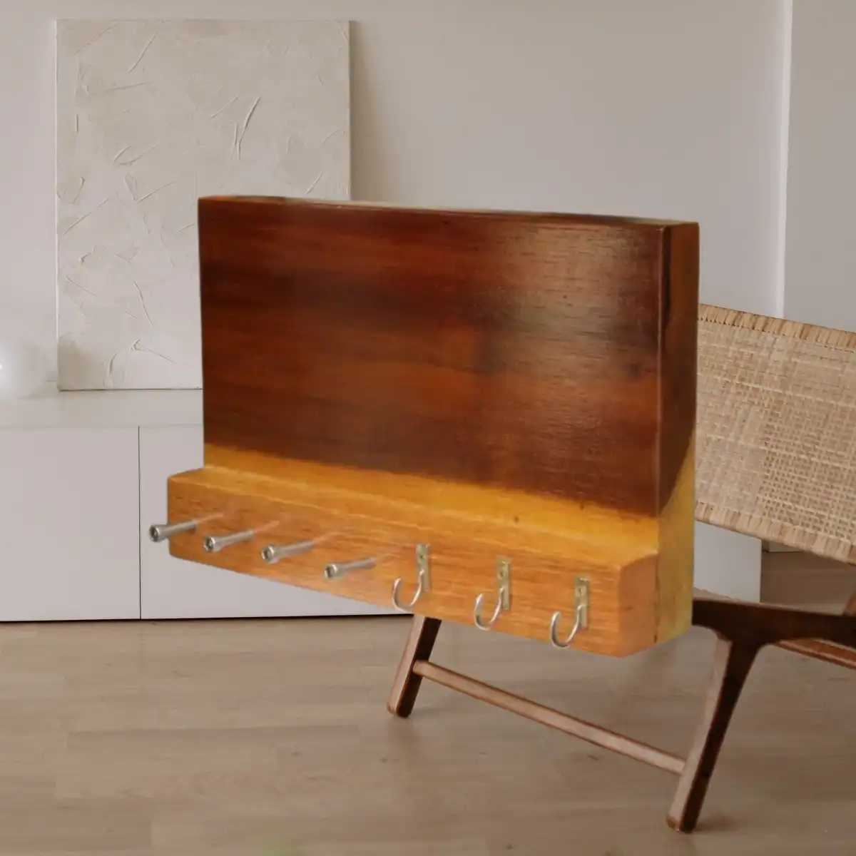¿Cansado de no saber dónde dejaste las llaves? Este porta llaves vertical en madera de cedro natural mantiene todo en su lugar con estilo y calidez. Sus ganchos metálicos resistentes y su diseño artesanal lo convierten en una pieza decorativa funcional que transforma tu entrada al instante 🔑.