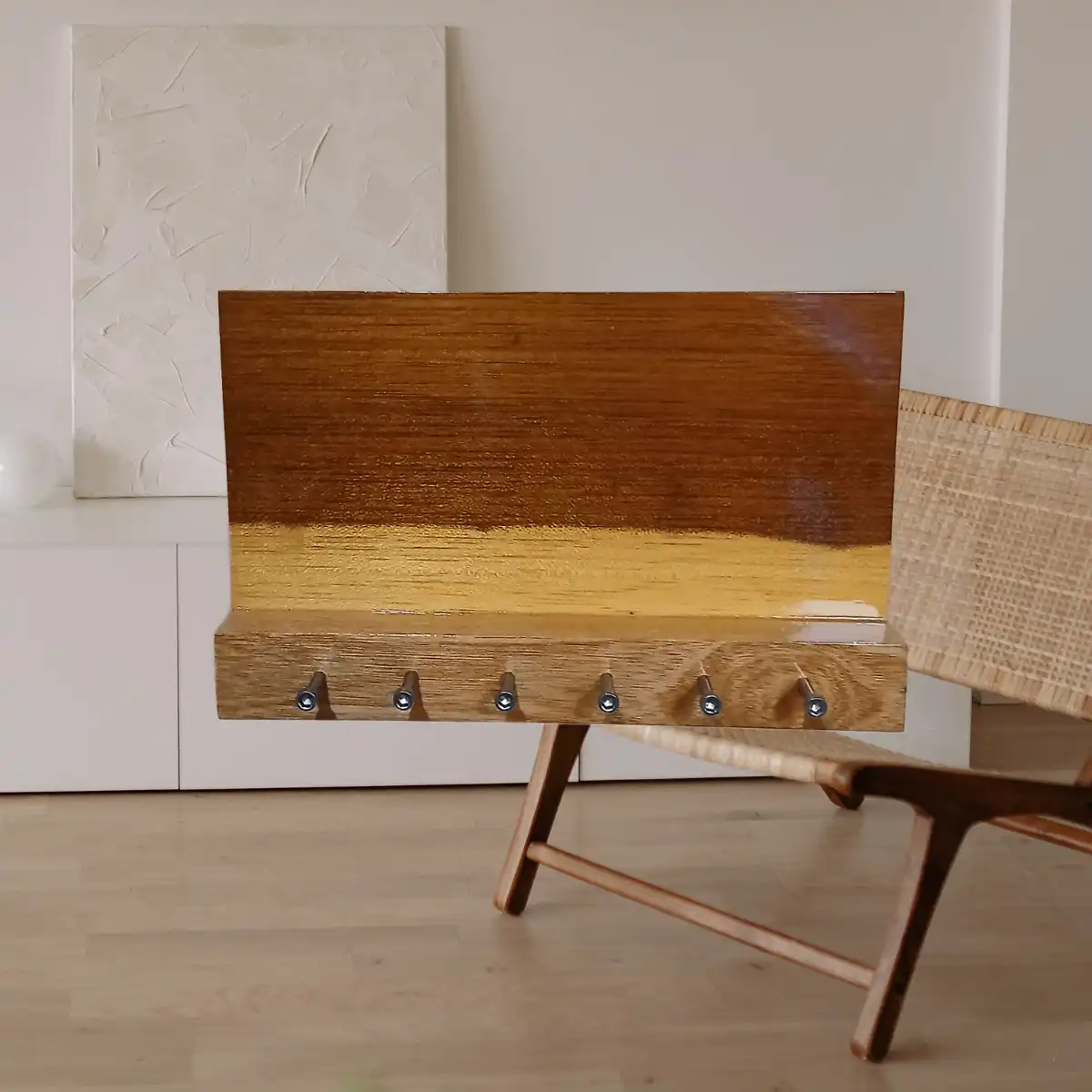 Este porta llaves horizontal de madera natural no solo organiza, también decora. Está diseñado para mantener tus llaves siempre accesibles mientras aporta calidez y estilo a tu hogar. Ideal para la entrada, cocina o pasillo.